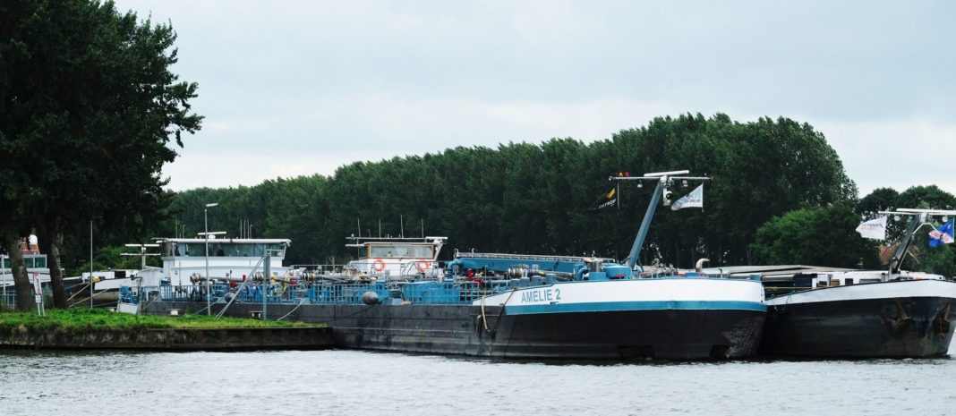 Het mts Amelie 2 kroop donderdagmorgen bij Nigtevecht op het Amsterdam Rijnkanaal door het oog van de naald. Door roeruitval kwam de richting Amsterdam varende tanker in de bakboordwal terecht.