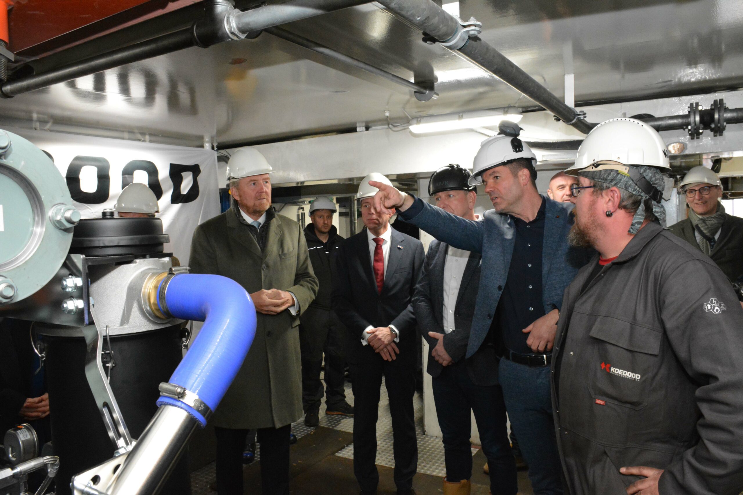 Hij nam onder meer een kijkje in de machinekamer van de Roermond Max. Dat schip ligt bij Koedood Marine voor de ombouw naar elektrische aandrijving. Eigenaar Nedcargo heeft gekozen voor de uitwisselbare batterijcontainers van ZES. Bij Holland Shipyards liet hij zich aan boord informeren over de ombouw van een ander schip naar een ander soort voortstuwing. Het FPS Waal van Future Proof Shipping. Dat krijgt een aandrijving op waterstof.