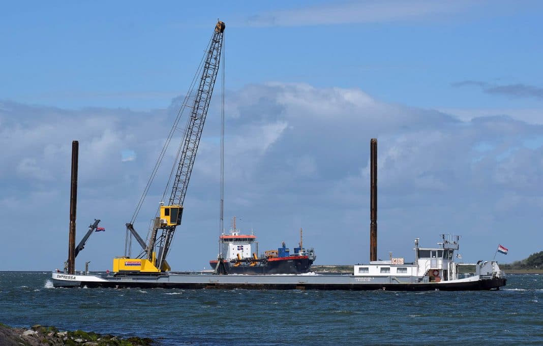 De Empressa schiet het Breeddiep in en tussen haar spudpalen door is de opvarende Ecodelta te zien. Die komt terug van ‘stort’ en gaat een nieuwe vracht baggeren. Het op diepte houden van vaarwegen en havenbekkens is een continu proces en in het Rotterdamse havengebied gaat het jaarlijks om zo’n 11 miljoen ton baggerspecie.