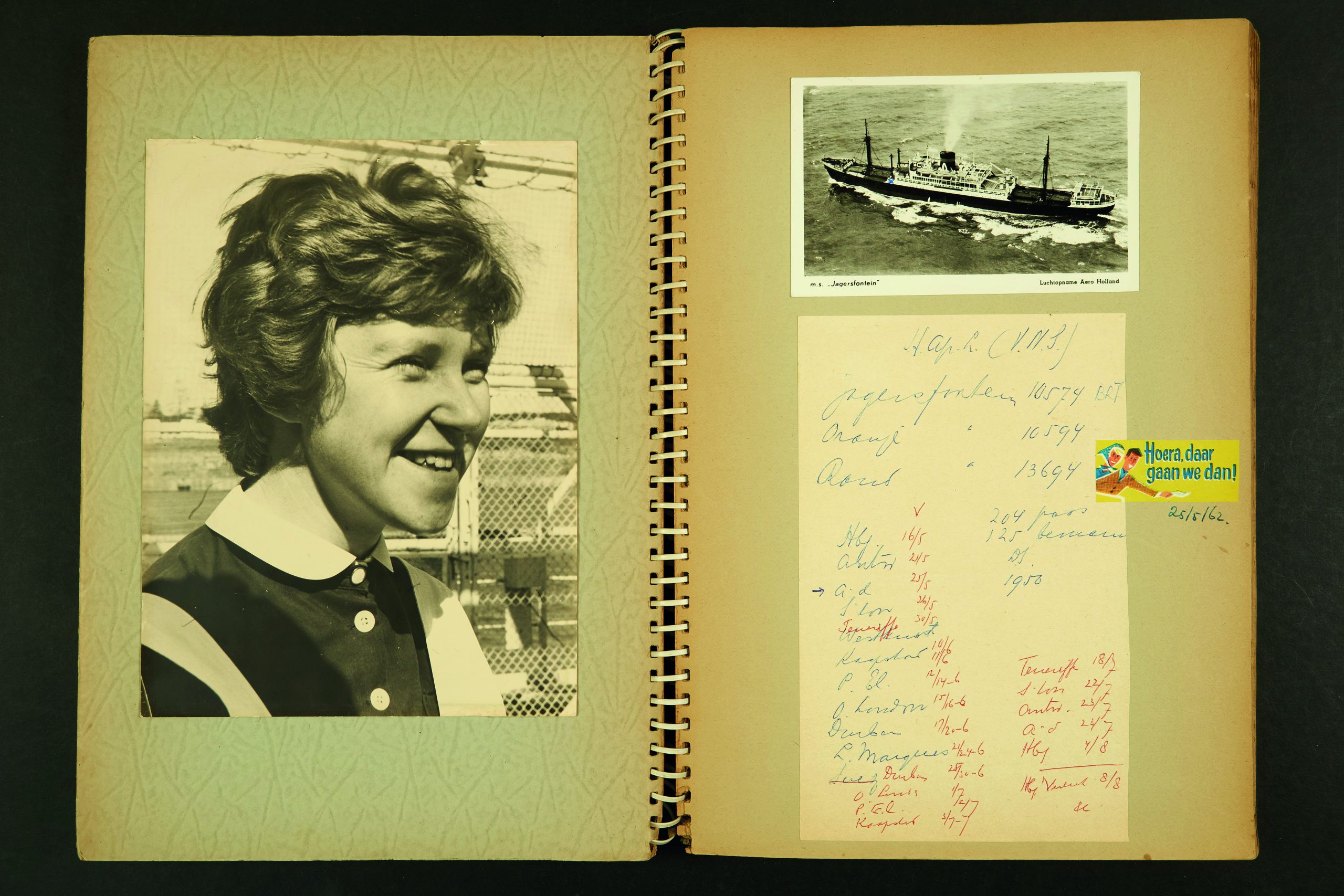 Hofmeesteres en kindermeisje Thea Petiet voer tussen 1958 en 1969 de wereld over, waardoor er bijna geen plek of werelddeel is waar ze niet is geweest. Dat paste deze reislustige en avontuurlijke vrouw uitstekend. Plakboek met foto van Thea Petiet. (Foto: Maritiem Museum)