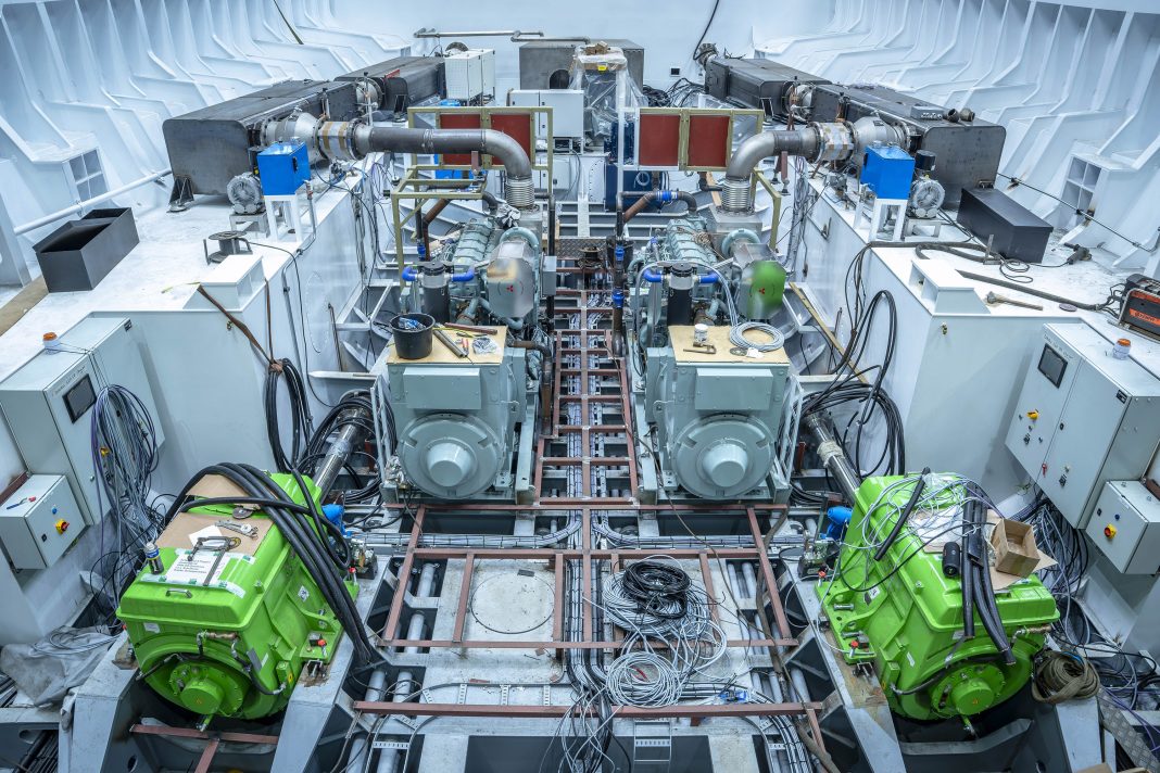 De machinekamerindeling was een complexe puzzel, vertelt Martin Poppen. “Het schip is een dubbelschroever en heeft twee grote elektromotoren, twee generatoren, uitlaatgasnabehandeling, veel elektriciteitskasten en drukvaten voor de vloerverwarming die restwarmte van de generatoren gebruikt. Vanwege het nogal gestroomde onderwaterschip blijft er daardoor zeer weinig ruimte over in de achterzijde van de machinekamer.”