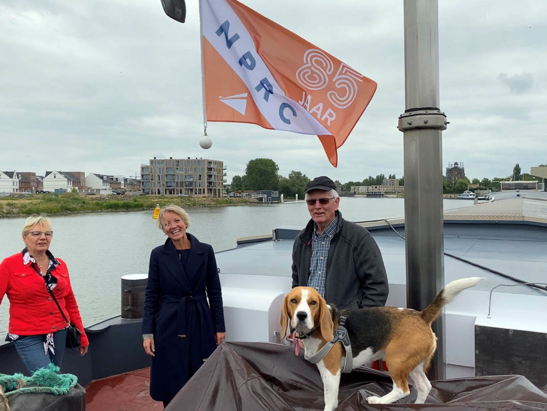 Meer dan duizend schepen hebben in de afgelopen 85 jaar de NPRC-vlag gevoerd. “De typische oranje vlag met witte balk die elke binnenvaartschipper van een afstand herkent. De NPRC-vlag staat symbool voor ondernemers die samenwerken om de economische positie van de particuliere binnenvaart in de keten te versterken.” Vandaar dat de nieuwe directeur Femke Brenninkmeijer – zij volgde op 1 juni Stefan Meeusen op – de speciale jubileumvlag hees aan boord bij Teun en Mariëtte Buitendijk.