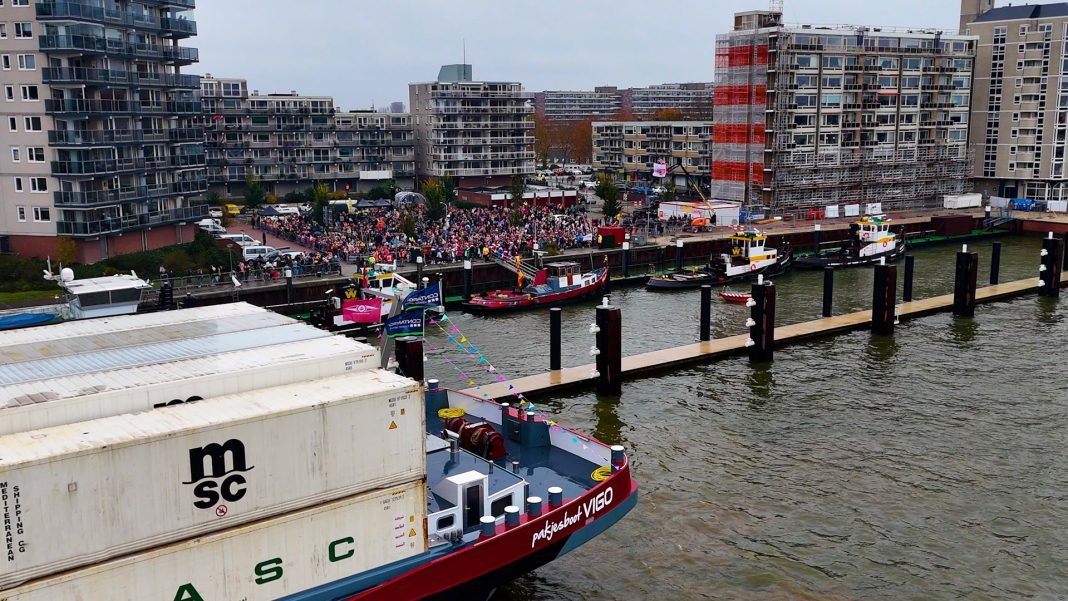 Na een paar aankomsten bij het gemeentehuis arriveerde Sinterklaas dit jaar weer als vanouds aan de kade. Het werd een passende entree in dé binnenvaartgemeente van Nederland, want de goedheiligman uit Spanje kwam niet alleen met zijn stoomboot, maar ook met een containerschip. Het was de (pakjesboot) Vigo van Bosman Shipping Group, met containers vol cadeaus. Dat zorgde voor flink wat open monden en grote ogen op de kade!