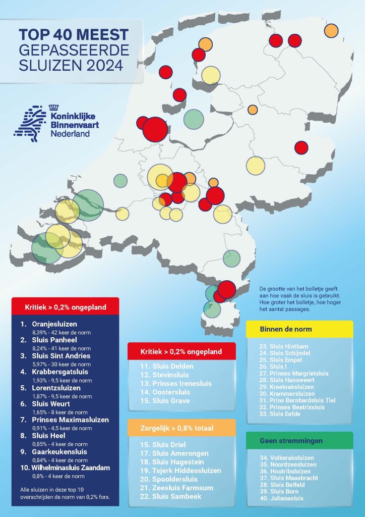 De top -5 drukste sluizen die in 2024 niet voldeden aan de norm zijn: