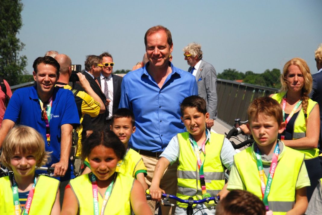 Directeur Prudhomme (foto boven) van de Tour de France heeft dinsdagmiddag 30 juni de Nieuwe Heemsteedse brug geopend. De Fransman het startsein aan fietsers uit Houten en Nieuwegein, die onder luid getoeter van een scheepshoorn van een Rijkswaterstaatvaartuig de oversteek over het Amsterdam-Rijnkanaal maakten.