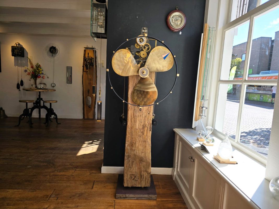 Tot hij in de zaak van klokkenmaker Jacob ten Hoeve allerlei bijzondere uurwerken zag. Dat maakte dat Folkert Jan hem vroeg of hij er een van de schroef zou willen maken. De 3-bladsschroef, met een diameter ruim 50 centimeter, draait en geeft de uren aan; een klein klokje bovenop is er voor de minuten.